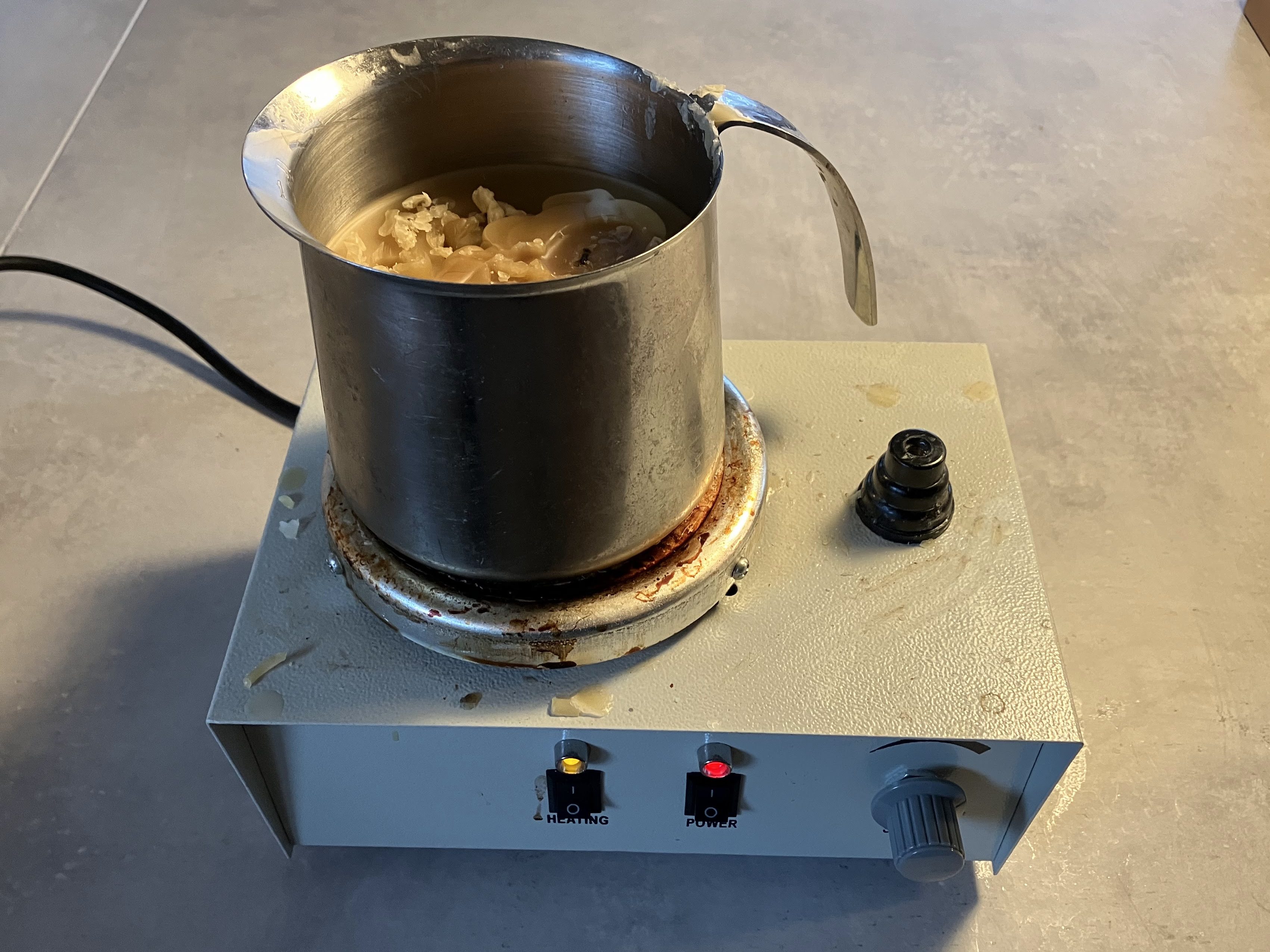 -melting pot: I use an old frothing pitcher and this crazy hot plate/lab stand I bought during covid to teach chemistry at home. They make wax melters that probably work better but I just like that this one also allows for magnetic stirring during chemistry experiments. Though, if buying again I’d opt for temp control.