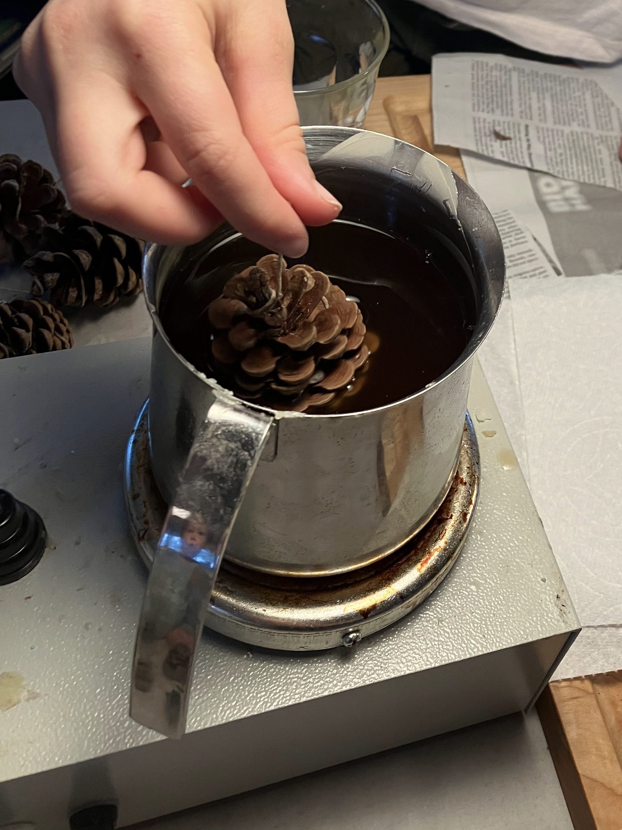 So finally I decided to test a few firestarter recipes and this is my favorite. It uses my beeswax candle setup, a bunch of wick and our homegrown pinecones.