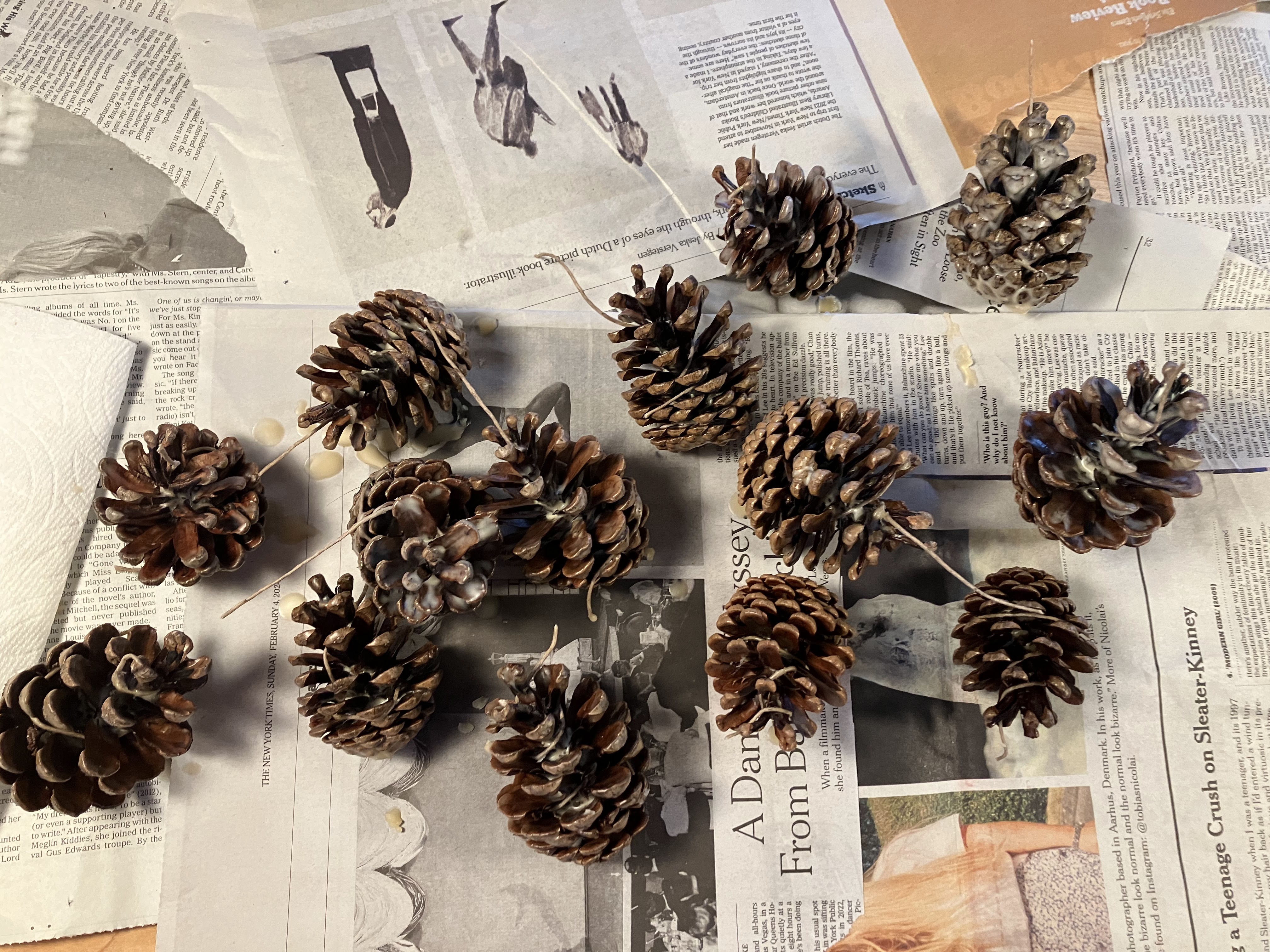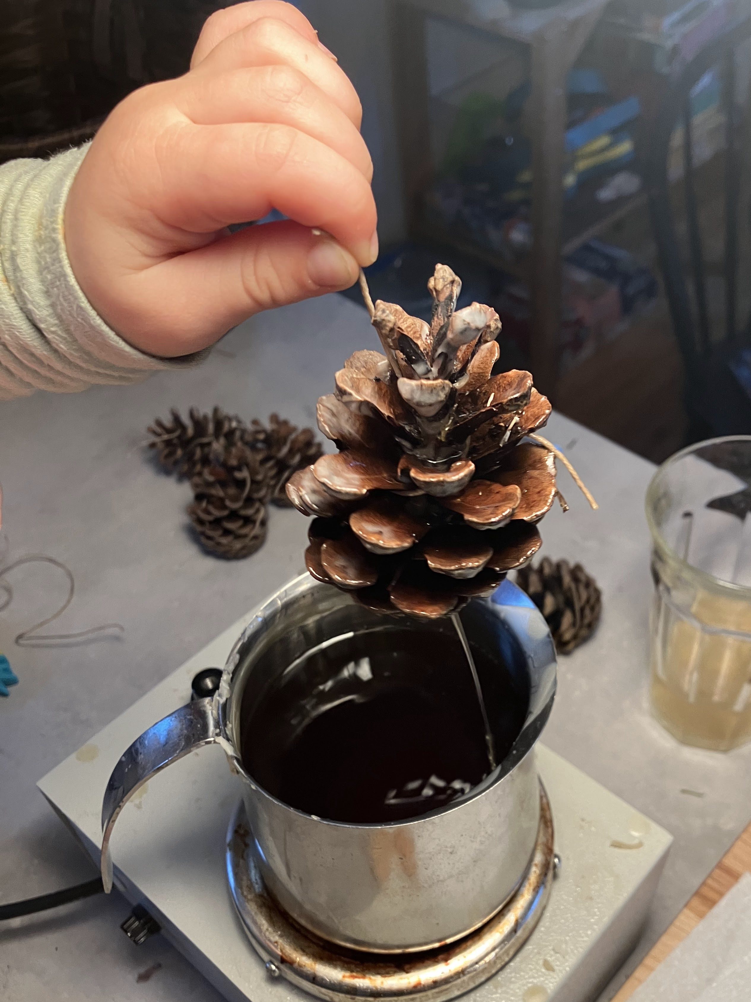 Dip the pinecones in the wax at least once – you don’t need to build up a bunch of coats here, especially if you are going to be burning them in a stove, but just enough to help turn the pinecone into a slower burning firestarter. For campfire use you could do a few coats perhaps.